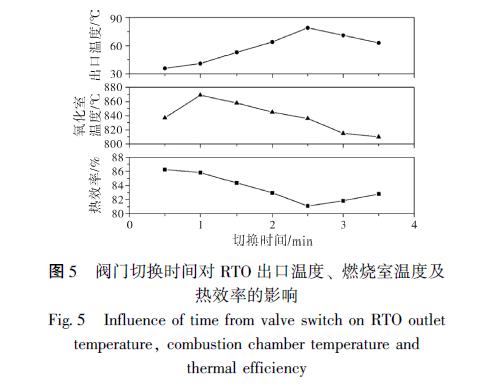 分, 不利于提高熱效率和廢氣處理效率。同時, 熱效率也隨著切換時間的增加而減少, 不利于VOCs 的高效處理和余熱利用。切換時間的逐漸增加在2 ~ 2. 5 min 時, 蓄熱室吸收的熱量增加, 導(dǎo)致蓄熱室與煙氣的溫差減小, 排氣出口溫度升高, 且燃燒室溫度和熱效率仍有降低。隨著切換時間的進一步增加到2. 5 分鐘以上, 進氣過程的蓄熱室溫度進一步下降, 導(dǎo)致進氣蓄熱體和燃燒室中的氣體溫度繼續(xù)下降, 在排氣過程中供給蓄熱體吸收的熱量減少, 排氣出口溫度開始下降, 有利于熱效率的提高。
